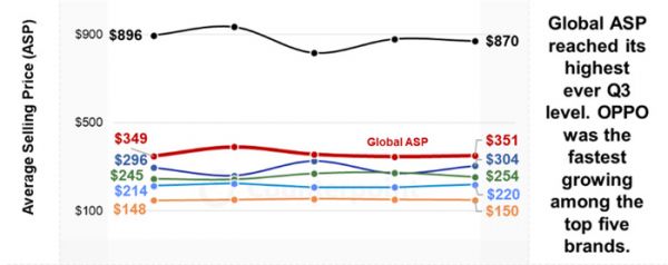 OPPO是前五品牌中平均售价增速最快的品牌,同比增长3.4%达到254美元。vivo相较于去年同期平均售价增长6美元,小米则是增长了2美元,以150美元的平均售价垫底。