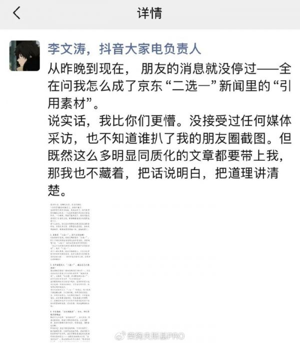 而今日,李文涛再发长文开火,称京东要求商家二选一没什么好洗的,李文涛指出2021年国家市场监督管理总局早有定论,在某电商平台 “二选一”处罚决定里写得清清楚楚:禁止平台内经营者参加其他竞争性平台促销活动”,就算 “二选一”。