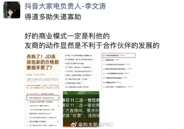 网传截图显示,京东要求商家不强调低价、不搞直播抽奖、不发优惠券。还专门组建了巡查小组,巡查商家的抖音直播间,一旦发现商家有违规现象,就会对其处以百万、千万级别的罚款。之后,消息称,美的因为价格问题,被京东罚款了500万元,然而这一传闻被双方否认。京东则回应,近期“京东对美的巨额罚款”“京东二选一”等谣言,是因为京东要求在自己平台上的售价不能高于其他平台,引发与抖音直播间之间的价格竞争而产生的。然而这事还没完,疑似抖音大家电负责人李文涛近期曾在朋友圈喊话京东:“得道多助失道寡助,好的商业模式一定是利他的,友商的动作显然是不利于合作伙伴发展的。”