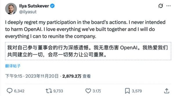 在此期间,Ilya Sutskever也改变了立场,最终转为支持奥特曼回归。