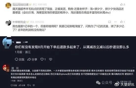 更有商家经过统计发现,点击量增加的同时转化率变化不大,反而退货率飙升,“闪购进来这两个月退货率加了二十了, 没看到外卖转化,只看到羊毛党”,尤其是8月开始退款变多。有人调侃,外卖大战最大受害者实则是深受背刺的老电商人。