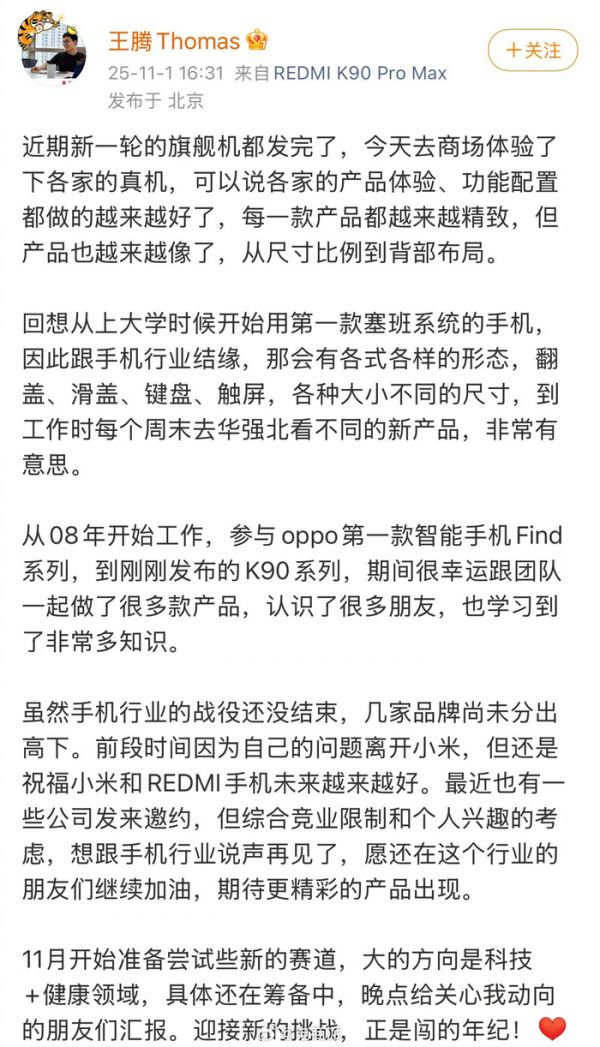 王腾离开手机行业转战新赛道