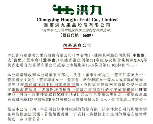 从2022年风光登陆港交所、市值突破600亿港元,到如今濒临退市,洪九果品的崩塌,不