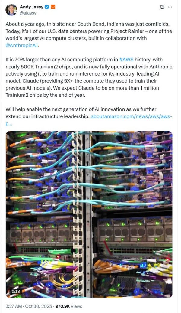 公司位于美国印第安纳州南本德附近的一片玉米地,如今已经成为全球最大AI计算集群之一——Project Rainier的核心数据中心。这一由AWS与AI独角兽Anthropic共同打造的系统,部署了近50万颗Trainium2自研芯片,规模比AWS历史上任何AI平台都大出70%,目前已全面投入运行。