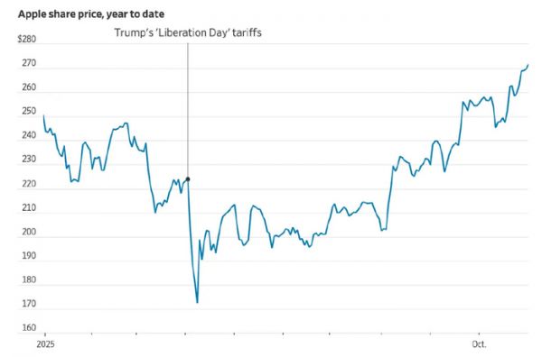 由于大多数iPhone仍在中国生产,当特朗普在4月份的“解放日”宣布征收大规模进口关税时,投资者陷入恐慌。苹果股价在随后几天暴跌逾20%。