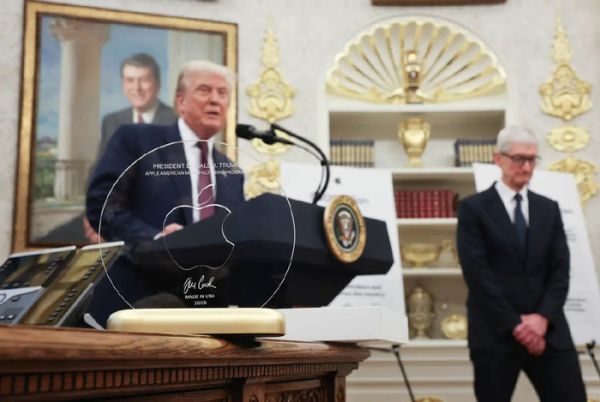 今年,库克再次祭出了这一策略。8月,他宣布苹果将在未来四年把在美国的投资承诺提高到6000亿美元。库克在白宫椭圆形办公室与特朗普站在一起宣布了这一投资,并赠送给特朗普一块底座镀金的艺术品。