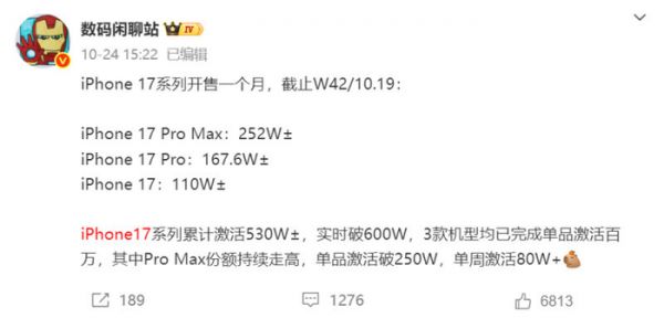据知名数码博主“数码闲聊站”爆料,iPhone 17系列上市1个月,即截至10月19日,累计激活530万±,实时破600万。其中,iPhone 17 110万±,iPhone 17 Pro 167.6万±,iPhone 17 Pro Max 252万±。显然,这无疑是个非常炸裂的成绩,有些国产安卓旗舰一年也卖不了这么多,而苹果只用了短短一个月便达成。