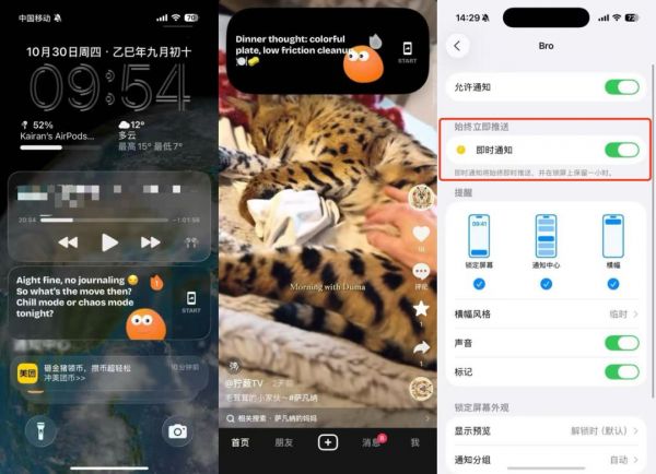 具体来看,在锁屏界面上,Bro 获取了“即时通知”权限,每条通知可以在锁屏界面上持续一小时,结合它推送通知的频率,基本可以做到“全天出现”,浏览 App 期间,也会通过“通知”出现,但和一般通知一样,几秒后就会消失。如果用户想与 AI 交互,则需要点击通知右侧的 Start,进入 App 中进行交互。