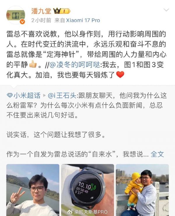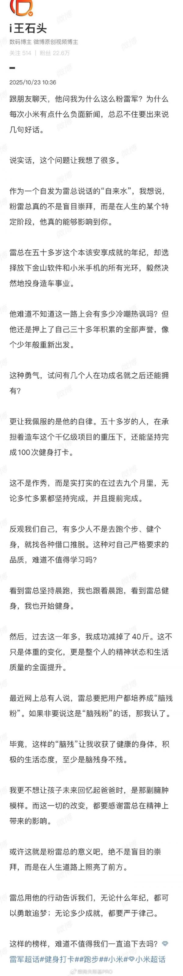 他还称,反观我们自己,有多少人不是去跑个步、健个身,就找各种借口推脱。这种对自己严格要求的品质,难道不值得学习吗?看到雷总坚持晨跑,我也跟着晨跑,看到雷总健身,我也开始健身。然后,过去这一年多,我成功减掉了40斤。这不只是体重的变化,更是整个人的精神状态和生活质量的全面提升。最近网上总有人说,雷总要把用户都培养成“脑残粉”。如果非要说这是“脑残粉”的话,那我认了。毕竟,这样的“脑残”让我收获了健康的身体,积极的生活态度,至少是脑残身不残。我更不想让孩子未来回忆起爸爸时,是那副臃肿模样。而这一切的改变,都要感谢雷总在精神上带来的影响。或许这就是粉雷总的意义吧,绝不是盲目的崇拜,而是在人生道路上照亮了前方。雷总用他的行动告诉我们,无论什么年纪,都可以勇敢追梦;无论多少成就,都要严于律己。这样的榜样,难道不值得我们一直追下去吗?