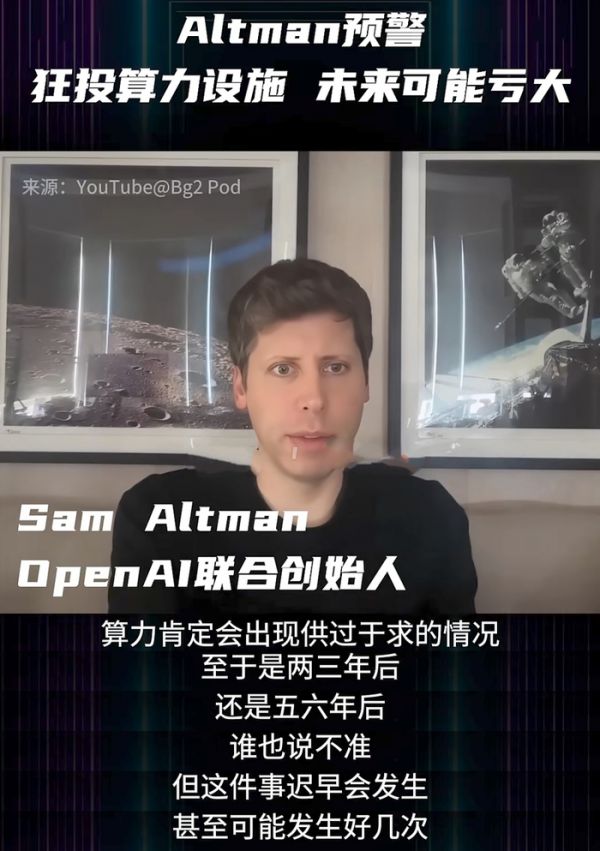 奥特曼更是直言:“算力过剩肯定会来,两三年还是五六年说不准,但这是必然,泡沫循环和人类心理都在推着这事发生。”