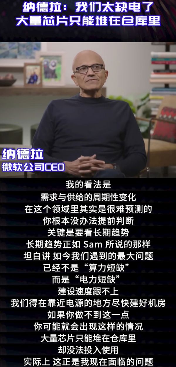 但同一天纳德拉就泼了冷水:“行业里有大量 AI 芯片堆积在仓库里用不了,微软的问题不是没芯片,是数据中心建设速度跟不上,电力短缺”