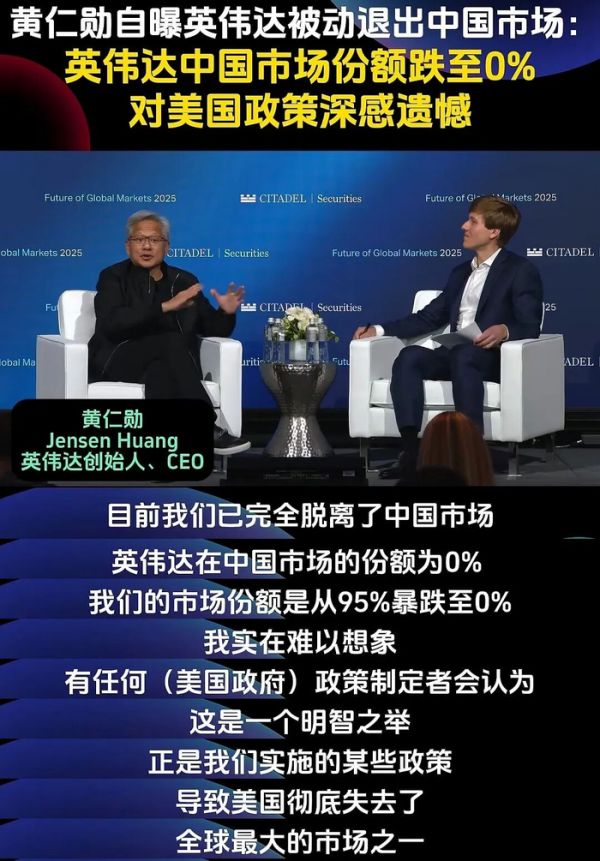 黄仁勋最近在访谈直言:英伟达在中国芯片市场的份额从 95% 跌到了零,还警告 “美国有可能落后,因为全球一半 AI 研究者是华人”。