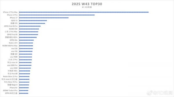 有博主统计了W43的手机单品销售情况,从图中可以看出,iPhone 17 Pro Max绝对是遥遥领先的存在,其次是iPhone 17 Pro,销量也稳居第二名,然后是iPhone 17略逊一筹排名第三。