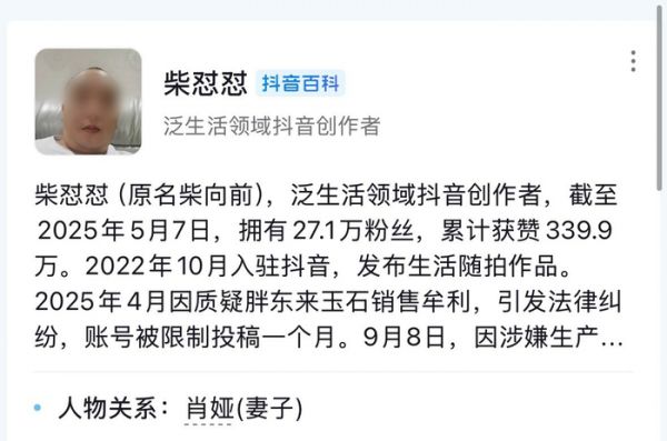 根据抖音百科信息,“柴怼怼”属于泛生活领域创作者,截至2025年5月,该账号拥有粉丝27.1万,累计获得点赞数达339.9万。