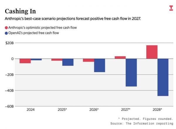 Anthropic正以高效的商业模式赶超OpenAI,如果按照预测的营收情况,Anthropic现金流比OpenAI提前三年转正,这或许意味着Anthropic无需再依靠外部融资,可能先OpenAI一步上市。