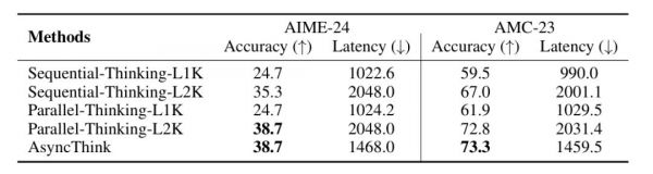 在 AIME-24 上:AsyncThink 的准确率为38.7%,延迟为 1468.0;在 AMC-23 上:AsyncThink 的准确率为 73.3%,延迟为 1459.5。相较传统并行推理,它在保证精度的同时减少了约 28% 的推理延迟。