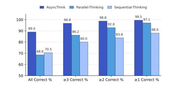 AsyncThink 的全对率达到 89.0%,比并行思考(68.6%)和序列思考(70.5%)都高。这意味着它不仅准确率更高,还能覆盖更多解答。
