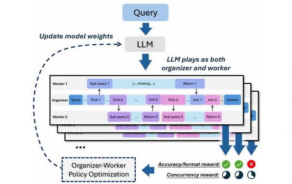 训练时,研究团队改进了群组相对策略优化(GRPO) 算法,让它适应异步结构。模型生成的不再是一条简单的思维链(CoT),而是一个由组织者和多个工作者组成的“思考结构”。最终的奖励会共享给整个结构的所有输出,确保每个部分都朝同一个目标优化。