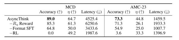 此外,研究团队还通过消融研究进一步分析了其性能,凸显了 AsyncThink“两阶段训练过程”的有效性。