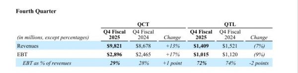 11月6日消息,美国当地时间周三,高通发布截至9月28日的2025财年第四财季(对应自然年2025年第三季度)及全年财报。