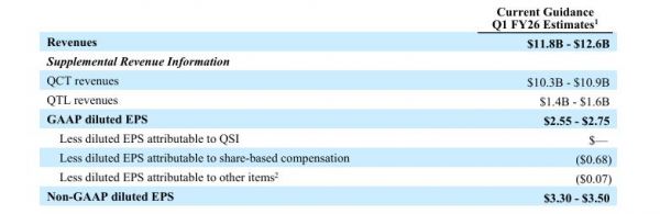 高通还预计,2026财年第一财季每股摊薄收益将在2.55美元到2.75美元之间;不按照美国通用会计准则,每股摊薄收益预计将在3.3美元到3.5美元之间,高于LSEG所调查分析师平均预期的3.31美元。