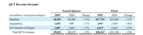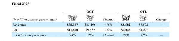 高通2025财年来自设备和服务的总营收为378.69亿美元,而上年为327.91亿美元;来自授权业务的营收为64.15亿美元,而上年同期为61.71亿美元。