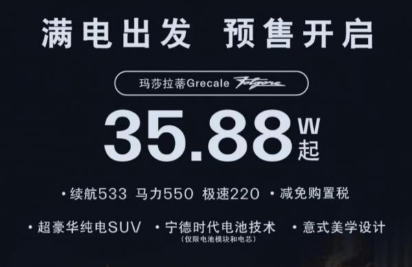 公开资料显示,Grecale Folgore是玛莎拉蒂于2024年12月推出的首款纯电动SUV,官方指导价为89.88万元。该车基于400伏电气平台打造,配备105千瓦时电池组,CLTC工况下纯电续航里程达533公里。按照35.88万元起的报价,相当于打了不到4折。