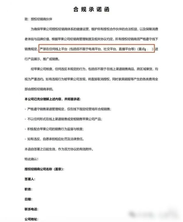 这份通知还是本月初出的,上面清晰表明:严禁苹果经销商于电商、社交、直播等各类线上平台开展产品展示、推广以及销售活动,就连“一件达”“小时达”这类服务也都被明确禁止。