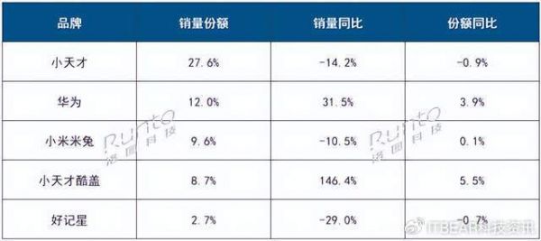小天才以27.6%的份额再度夺冠,不过销量同比下滑14.2%,份额微降0.9%。