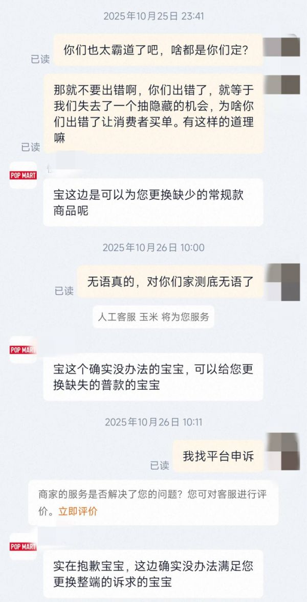 客服多次回复只能更换缺少的常规款(图据受访者)泡泡玛特:优先按照整端发货 可能存在库存异常