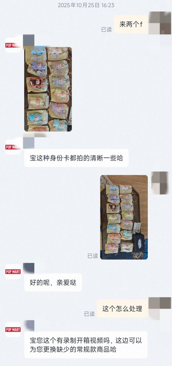 李女士联系客服,却被告知只能更换一个缺少的常规款(图据受访者)对此,李女士无法接受,她认为,商家发货存在问题,售后又出现“霸王条款”。“玩盲盒就像玩游戏,游戏最重要是规则,但他们提供的商品并没有遵守规则,售后也没有一个公平的处理方式。”李女士说,当时买整端,就是为了隐藏款,自己也明明有抽取隐藏款的机会,但商家只同意更换常规款,这是损害了自己的权益。