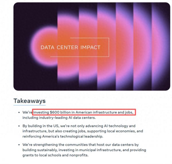 与其他科技巨头一样,Meta正处于AI投资热潮的中心。公司致力于实现“超智能”——即机器在思维上超越人类。过去两个月里,Meta披露了在得克萨斯州埃尔帕索、阿拉巴马州蒙哥马利和密苏里州堪萨斯城建设或扩建数据中心的计划。