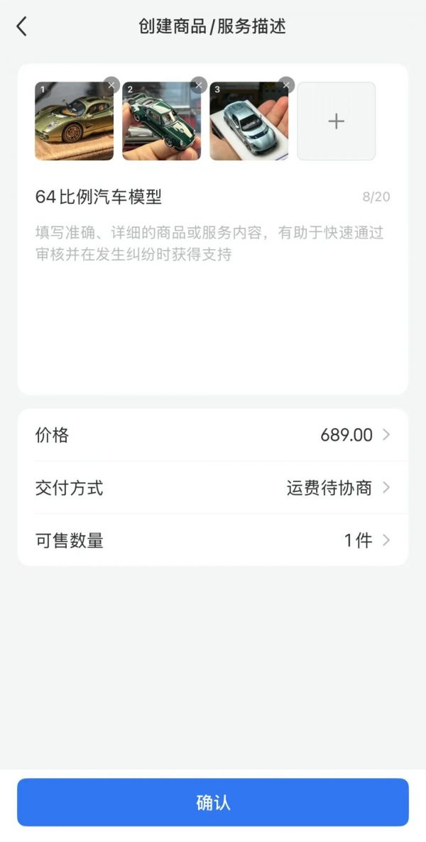 发布商品时填写商品介绍、价格、图片,这部分的功能丰富性没有闲鱼强。