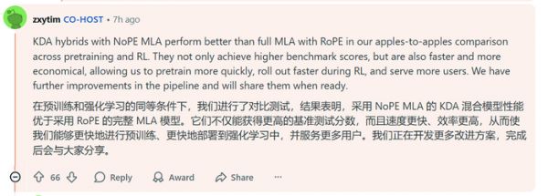 周昕宇在技术层面进一步解释了KDA的对比优势。他称,KDA混合架构结合NoPE MLA后,在预训练和强化学习阶段均优于采用RoPE的完整MLA。不仅基准得分更高,还更快、更经济,使他们能够更高效地训练、部署并服务更多用户。未来,月之暗面还有进一步改进,成熟后会公开。