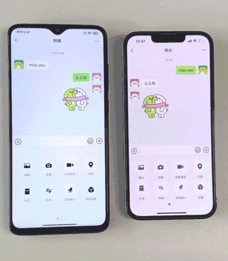 长按视频通话小窗口拖到屏幕上方就能实现分屏,不再是大小屏组合界面,而是上下屏幕一样大。于是,一张新面孔出现了,或许能解答“如果我们是一张脸会怎样”的哲学问题,比如这样: