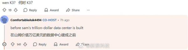 而当网友问及 K3 的发布时间时,杨植麟戏谑地回应道:“在 Sam 价值万亿美元的数据中心建成之前。”