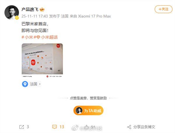 【#小米巴黎首家直营店即将开业#】日前,小米法国副国家经理@产品逸飞 在微博发文称,“巴黎米家首店,即将见面。”据了解,这家即将开业的小米之家为直营门店。
