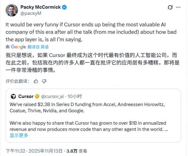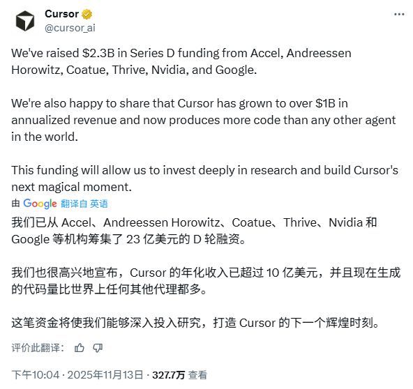 没错,就是那个让黄仁勋盛赞的Cursor。这一次,Accel和Coatue领投,谷歌和英伟达也亲自下场“跟投”了。