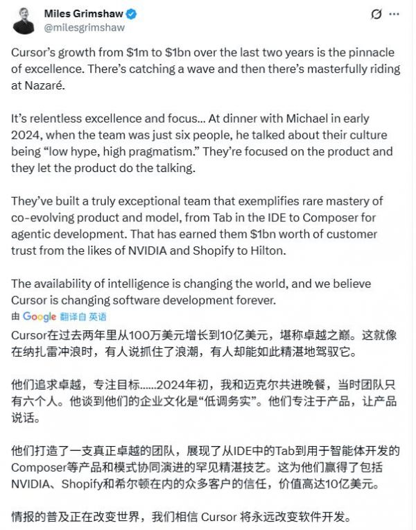在业绩表现上,Cursor也交出了亮眼答卷。年度经常性收入(ARR),已突破10亿美元大关。