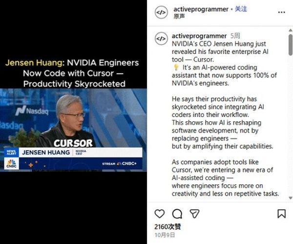 英伟达CEO黄仁勋10月份接受采访时,毫不掩饰地称赞Cursor,称其是他“最喜爱的企业AI服务”。