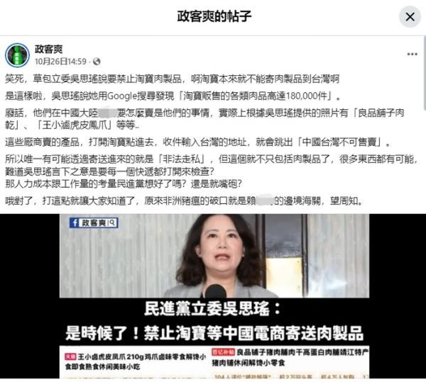 境外社交平台账号“政客爽”对所谓“禁止淘宝等中国电商寄送肉制品”的质疑。 图片来源:互联网截图此外,卓荣泰的要求也很快被“打脸”。台经济事务主管部门负责人龚明鑫明确表态,“没有要让淘宝落地,也不想让其在这边合规经营”。