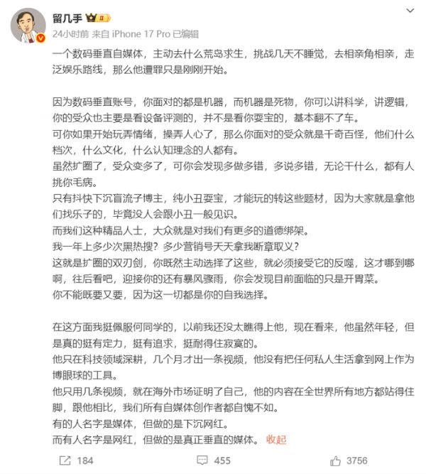 而且还提到了,数码垂直类账号面对的受众对象是机器这类没有生命力的东西,在这种情境下,创作者只要凭借科学知识和逻辑来输出内容,基本不会出现大的翻车事件。毕竟账号的主要受众是冲着设备评测来的,并非为了看创作者整活搞事情的。