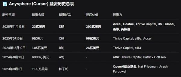 这是Anysphere近1年内完成的第三次融资,同期其估值增长了约1026%。2024年12月,Cursor完成了1.05亿美元的B轮融资,彼时投后估值为26亿美元;半年后,Cursor完成了9亿美元的C轮融资,彼时投后估值增长到99亿美元。Cursor在1年内筹集了超过33.05亿美元(约合人民币234.5亿元)。