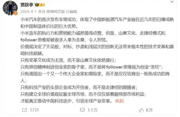 实际上,去年上半年,贾跃亭就在社交平台表达了对小米汽车的看法,肯定了小米汽车首次发布小米SU7的成功,但是也通过各种阴阳怪气的措辞,表达了对抄袭、对标、浅层次创新的不齿。当然了,作为一家一年交付不了20台车的车企CEO,表达这样的观点,很多网友都表示,贾会计还是酸了,比他老家的陈醋还酸,如果去年4月发布的是小米YU7,贾跃亭估计能当场气晕过去。