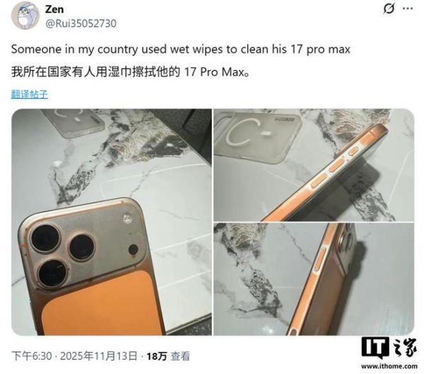 IT之家 11 月 16 日消息,网友 @Rui35052730 于 11 月 13 日在 X 平台发布推文,分享了 3 张照片,称星宇橙 iPhone 17 Pro Max 在使用湿巾清洁后,机身涂层被擦除。