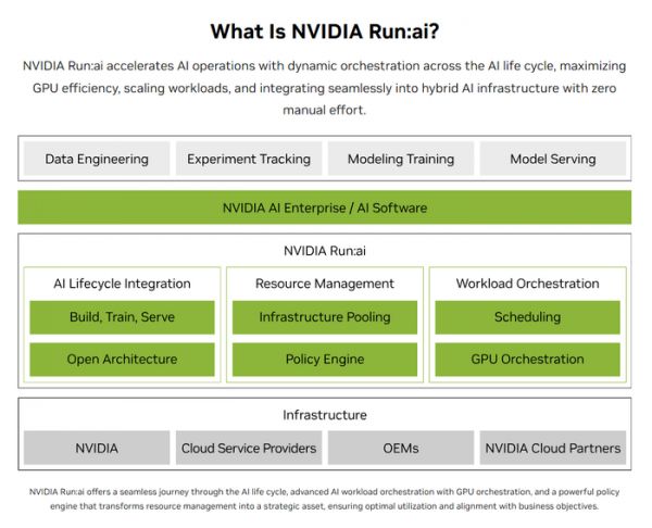 2024年12月,英伟达宣布以7亿美元(约合人民币51亿元)价格,收购2018年成立的以色列公司Run:ai。过去7年,这家公司做的产品只围绕一件事——怎么高效使用GPU,比如提供业务看板、GPU权限分配、任务分配等等直观可视化操作工具,本质是在做GPU的“数据产品经理”。