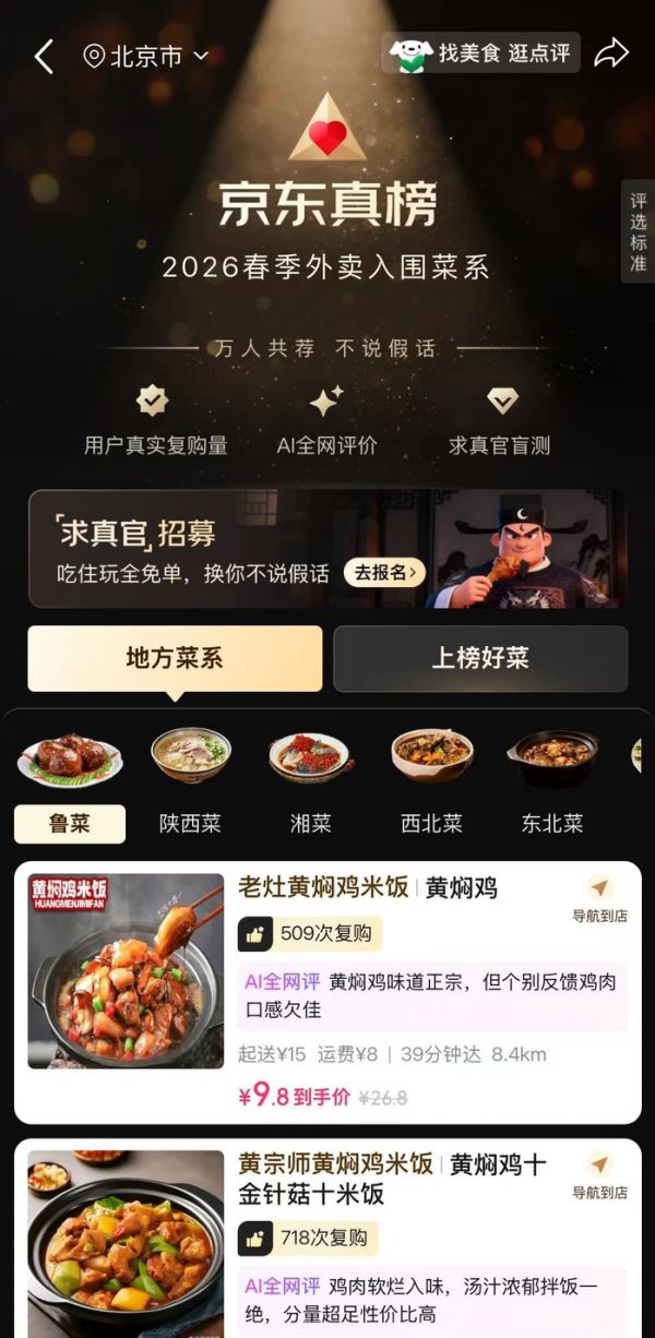 同步上线的京东真榜,在京东点评页面上方设有入口,用户也可通过搜索“京东真榜”“真榜”直达京东真榜榜单。该榜单以“万人共荐,不说假话”为口号,目前分为“地方菜系”和“上榜好菜”两大类目,不仅展示上榜菜品的复购次数、AI全网评价、单价等核心信息,还提供导航到店服务。