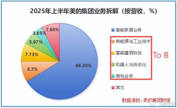 近年来,公司通过收购库卡机器人、控股合康新能等,不断扩展工业自动化、新能源、机器人等To B业务。2025年上半年,其To B业务合计实现收入657亿元,占比已达26%。