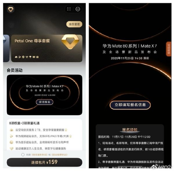 这次华为Mate 80系列 | Mate X7及全场景新品发布会的报名时间是11月17日到20日中午12点,各位Petal One尊享会员的朋友们,赶紧去报名,咱们没准能在发布会现场面基,第一时间体验新机!