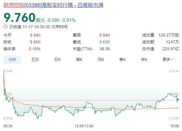 截至11月17日收盘,联想控股报9.76港元/股,公司总市值229.97亿港元。